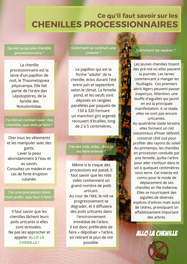 Leurs techniciens sont aussi formés et spécialisés, pour intervenir sur la destruction de chenilles processionnaires afin d'éradiquer ces insectes dangereux pour la santé humaine.