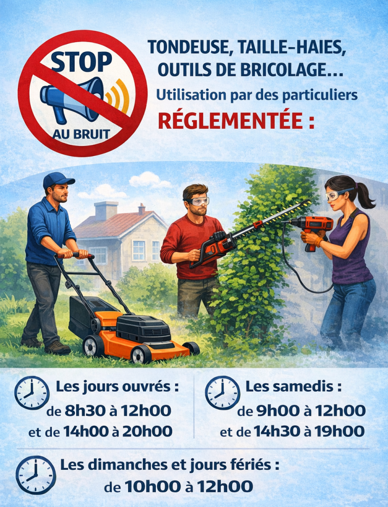 Les activités bruyantes effectuées par des particuliers, telles que la rénovation, le bricolage et le jardinage, réalisées à l’aide d’outils ou d’appareils tels que les tondeuses à gazon, tronçonneuses, perçeuses, raboteuses, scies mécaniques, bétonnières, compresseur à air ou haute pression, etc, susceptibles de causer une gêne pour le voisinage ne peuvent être effectuées que :